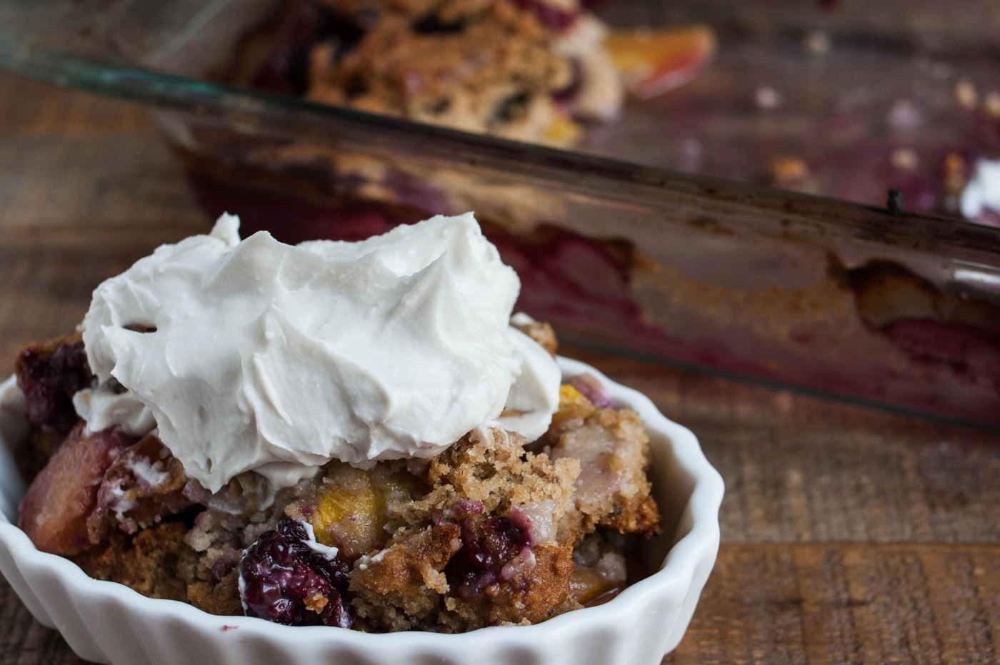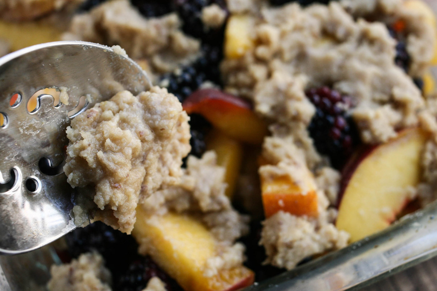 Fill a greased pan (I like to use coconut oil) with half of your fruit mixture. Using half of your batter, scoop tablespoons of batter on top of the fruit. Leave them in their scooped form and don’t spread the mixture. Layer the remaining fruit on top and then the rest of your batter.