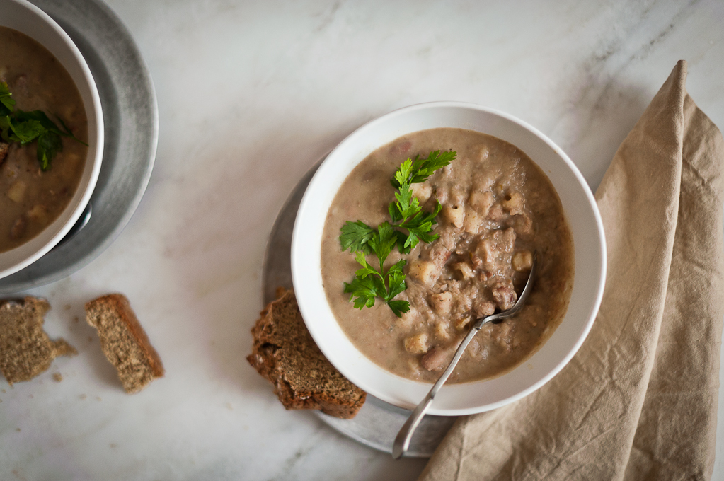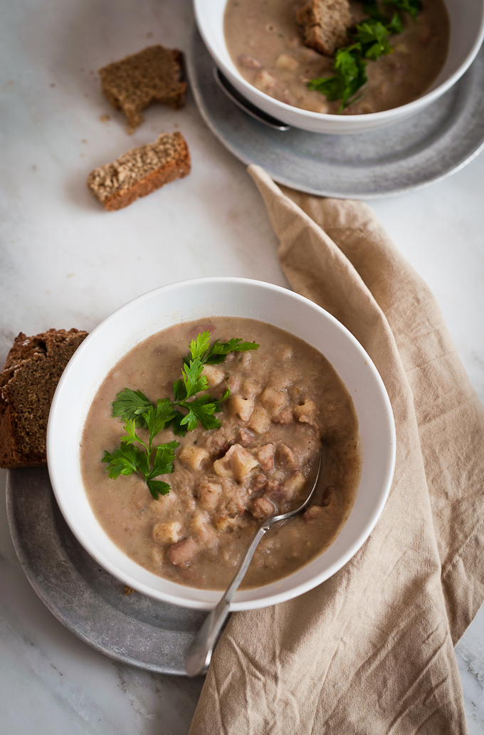 Place the soup back over medium heat, add the rest of the beans, and when it is boiling add the pasta. Pour in more stock if needed – you want a dense but still ‘soupy’ texture. Stirring very frequently to avoid the pasta sticking to the bottom. When the pasta is tender, turn off the heat and allow to cool for 5 to 10 minutes. Taste for salt and pepper and season accordingly. Serve with a drizzle of olive oil on top and crusty bread.