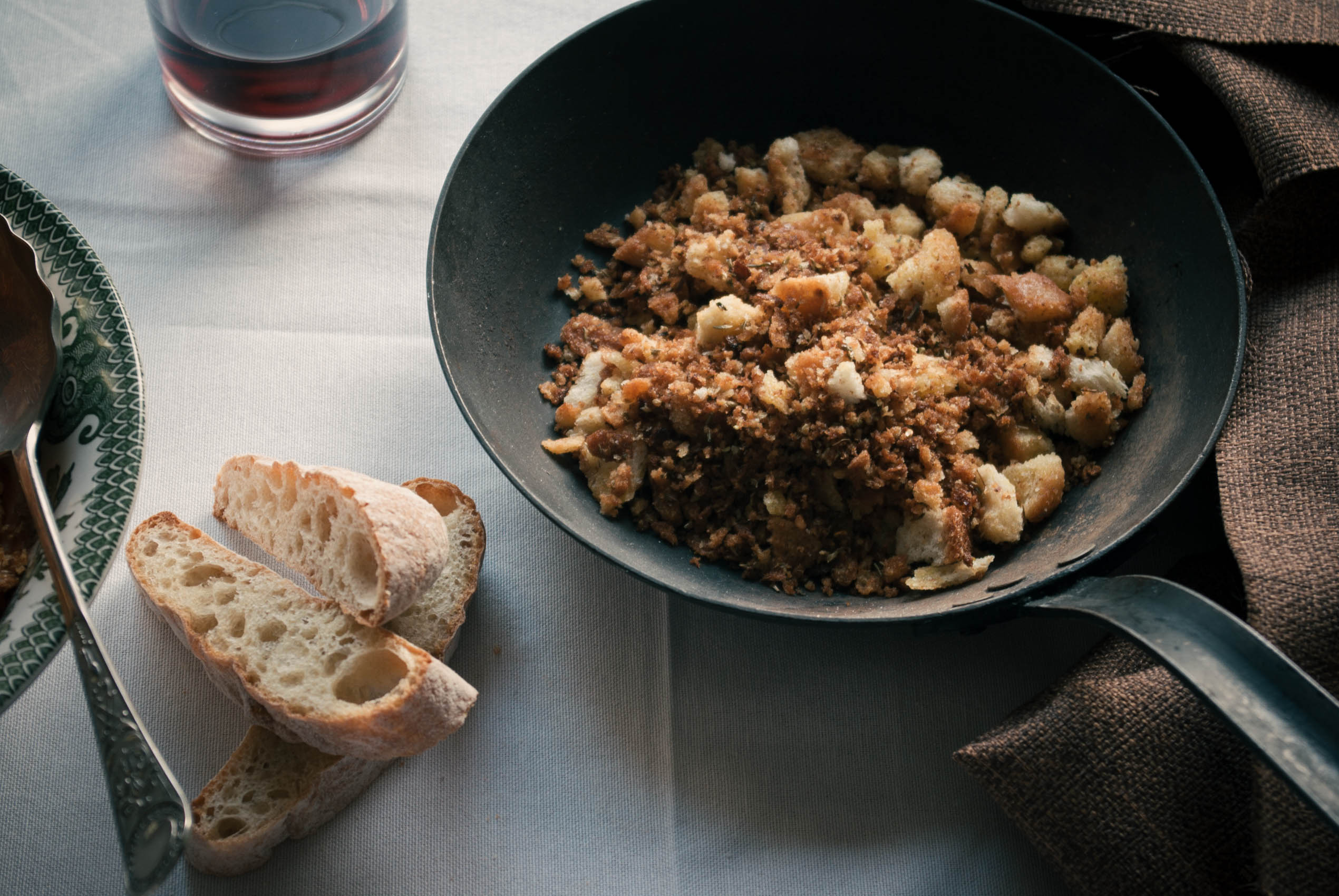 A handful of decent but stale bread, broken up into crumbs and thumbnail sized chunks.
