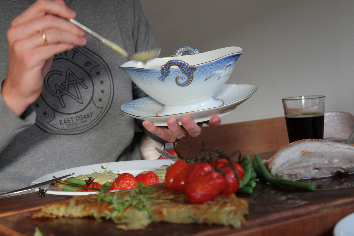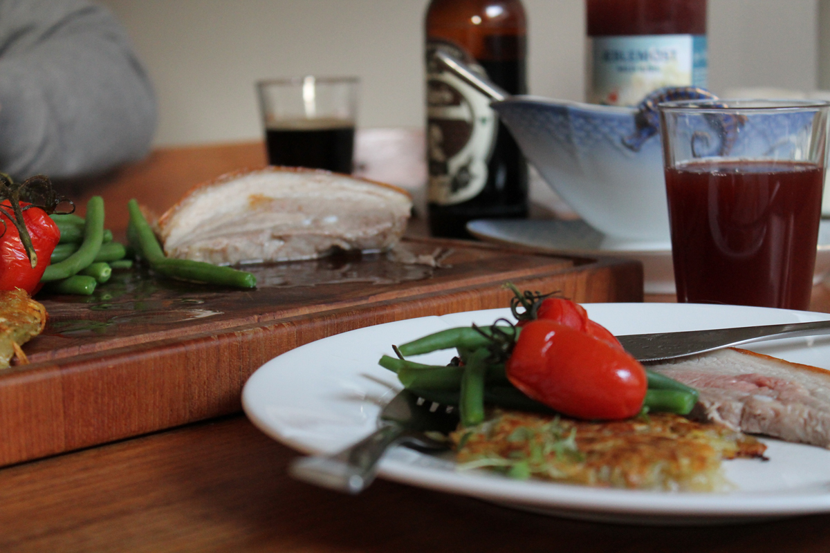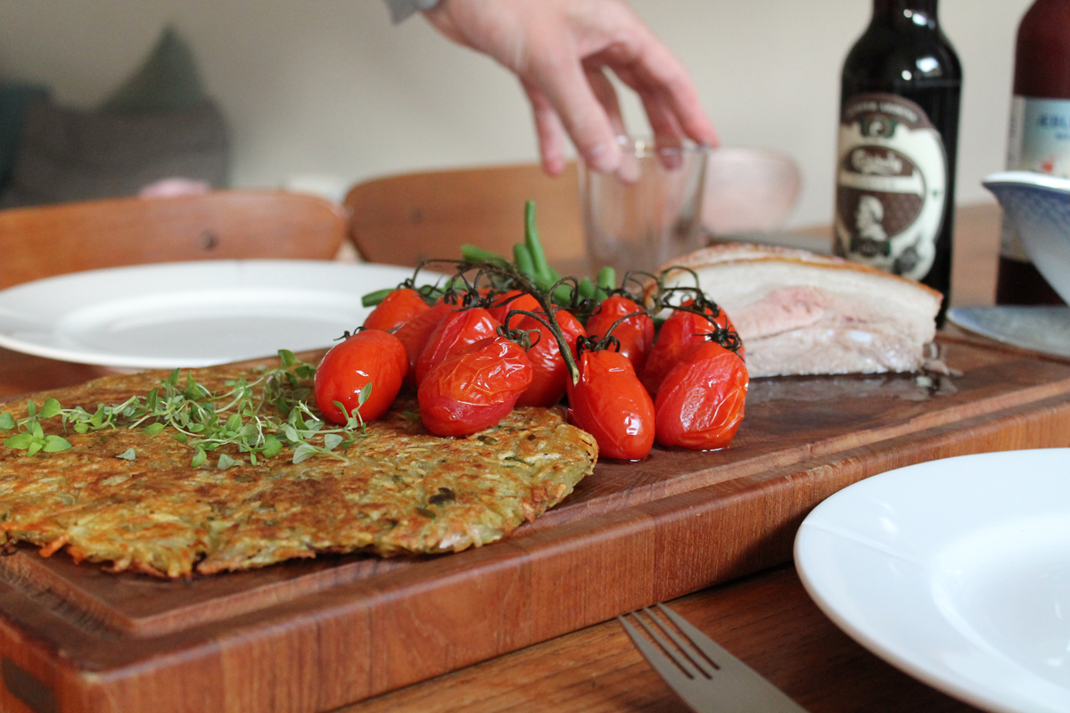 When the roast is done let it rest while you make the rösti. Wash the potatoes, I prefer not to peel them but it’s up to you. Grate them on the coarse side of your grater. Press the grated potatoes between your hands to remove the moisture. In a bowl mix the potatoes with fresh thyme, salt and pepper to taste. Melt a knob of butter in a frying pan on a medium heat. Add the potato mix to the pan and press down firmly. Let it fry for about 6 minutes on both sides*. Meanwhile, cook the green beans in salted water.