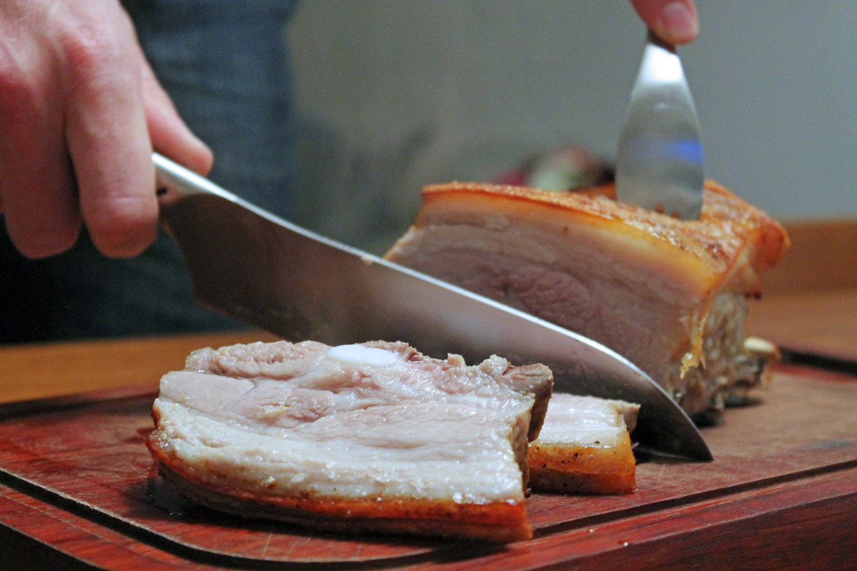 Remove the crackling if you didn’t eat it all on the previous day. Cut the meat in thick slices, then cut the slices in half and season. Put a frying pan on medium high heat with a good knob of butter.