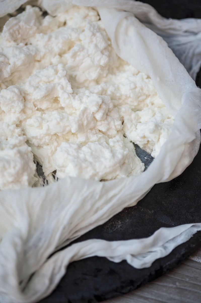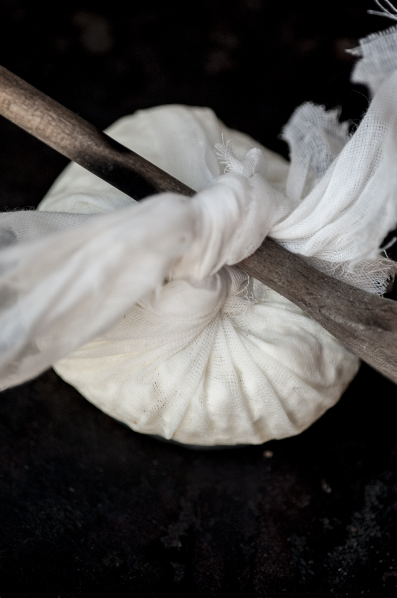 Hang up to drain (I tie the muslin around a wooden spoon and hang over a jar or bowl to drain off the whey). Leave for about an hour.